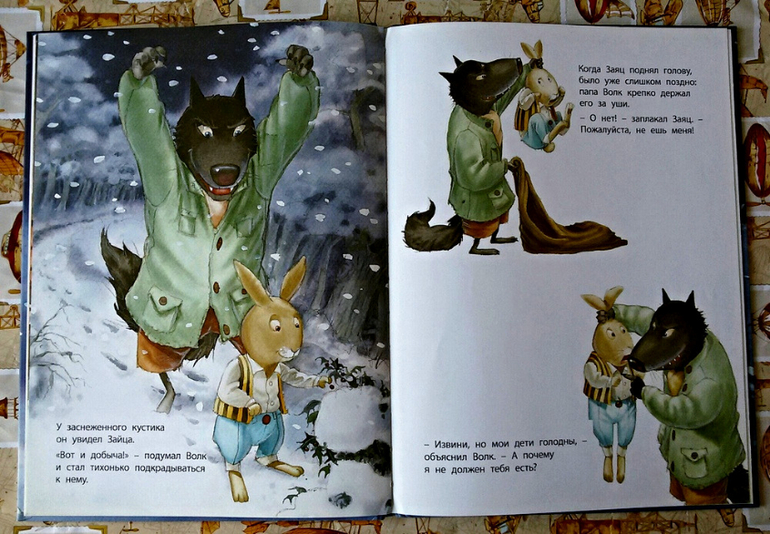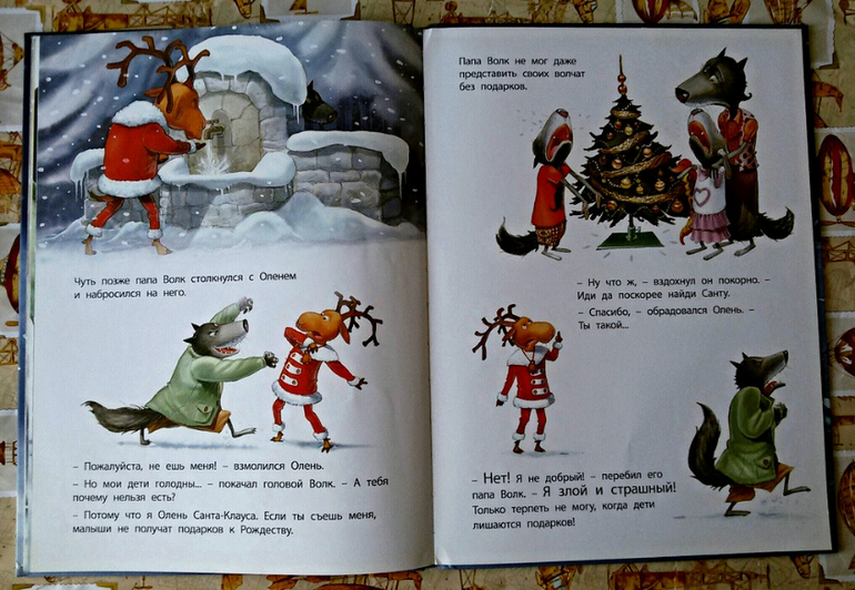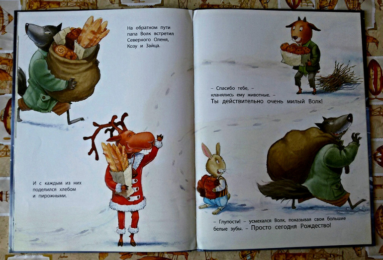 Своеобразная у него получилась охота. На поверку злой и страшный волк оказался добрым и понятливым. Как можно съесть зайца, который ищет что-нибудь вкусное для своих малышей? Или козочку, собирающую хворост, чтобы ее старая мать могла погреться у огня? Я молчу про оленя Санта-Клауса, без которого у детей не будет подарков!