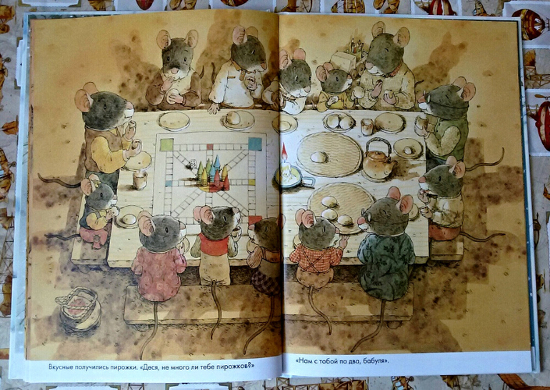 Сначала мы видим большое дерево в зимнем лесу. На улице вьюга, а в единственном маленьком окошечке горит приветливый огонек. Это домик 14 лесных мышек. В нем тепло и уютно. Некоторые мышата делают самодельную настольную игру, остальные мастерят санки, а взрослые мыши выпекают сладкие булочки. Как же здорово подкрепиться вкусными пирожками и сыграть несколько увлекательных партий в занимательные колпачки.