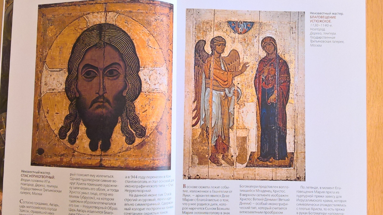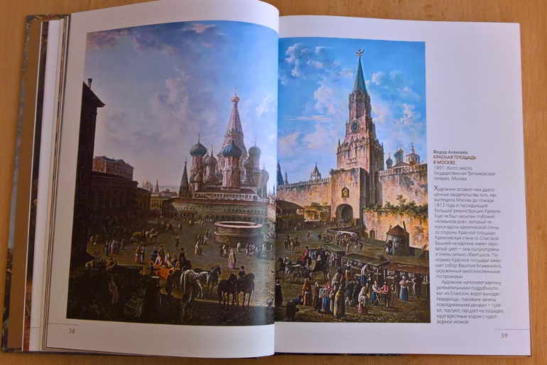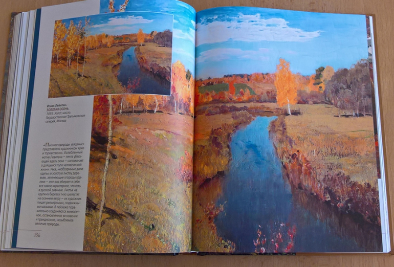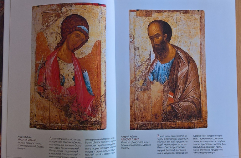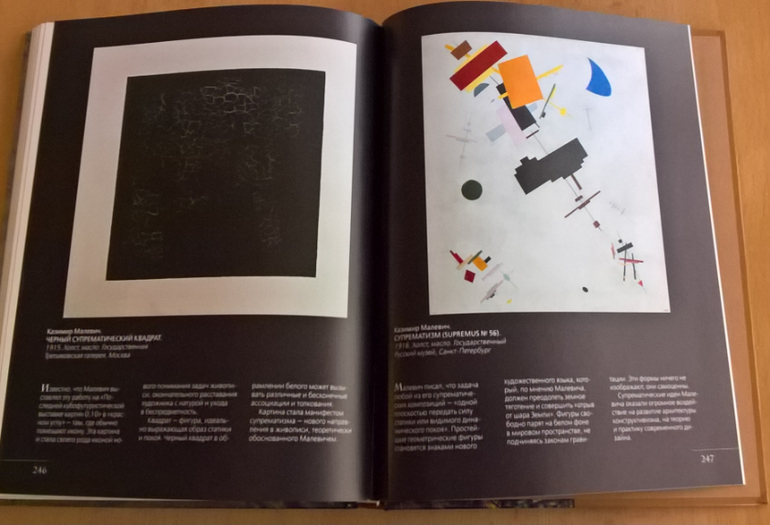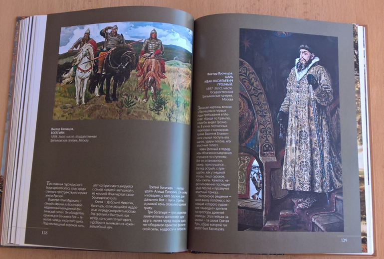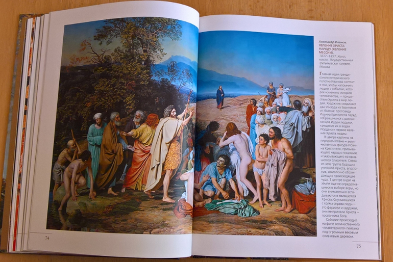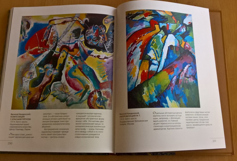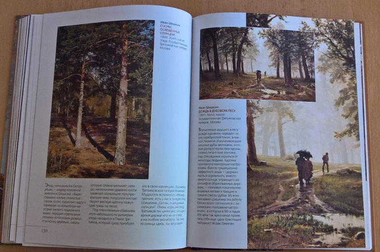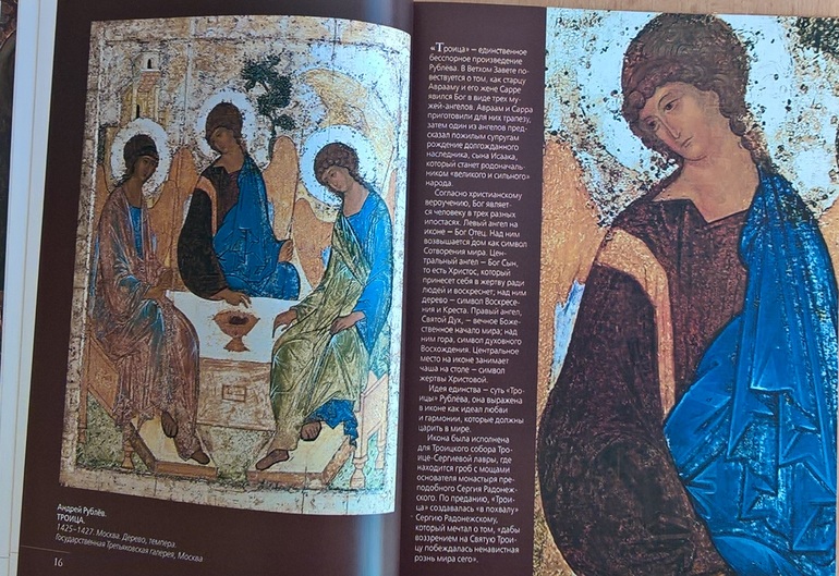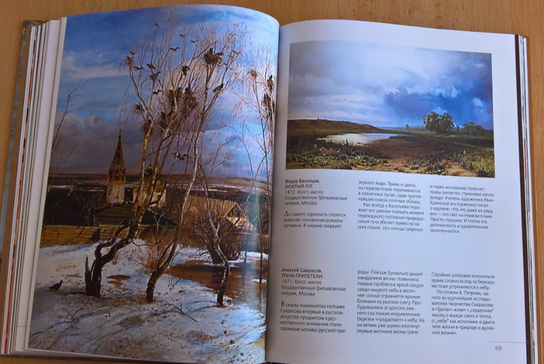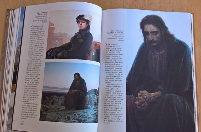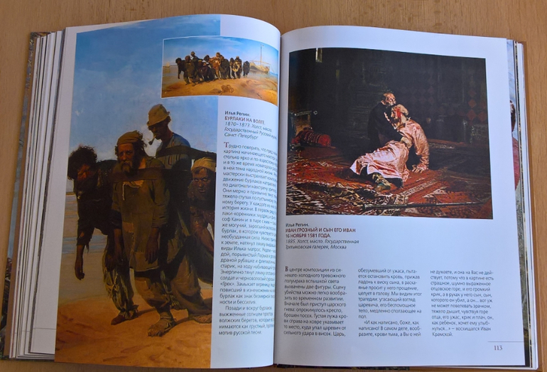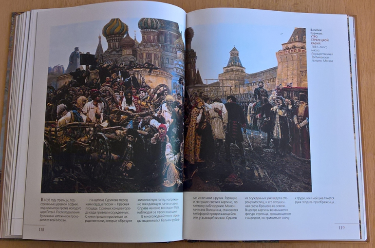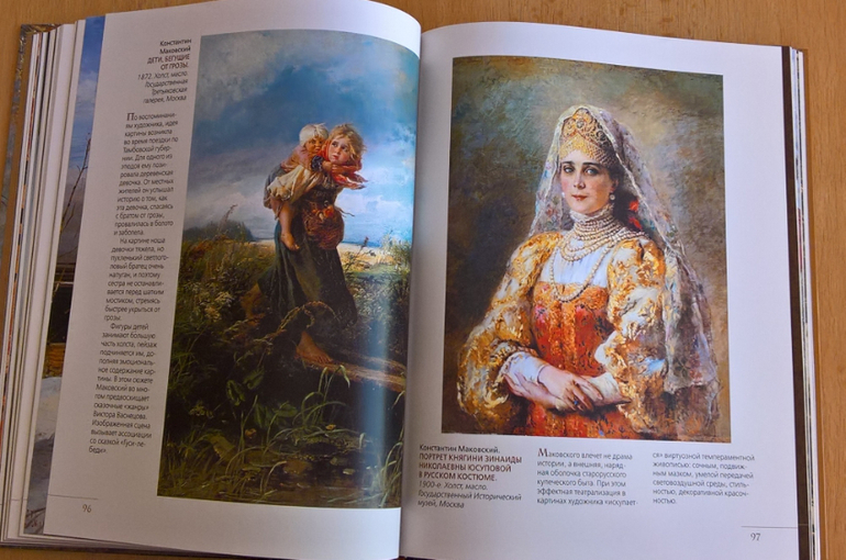 Произведения живописи расположены в хронологическом порядке, начиная с образцов древнерусской иконописи. Возле каждого шедевра указывается автор, название, год, техника живописи, место постоянной экспозиции и небольшое описание картины - что изображено, почему и зачем. Текста немного, все очень по существу, интересно и познавательно. В основном представлены произведения Государственной Третьяковской галереи (Москва) и Государственного Русского музея (Санкт-Петербург).