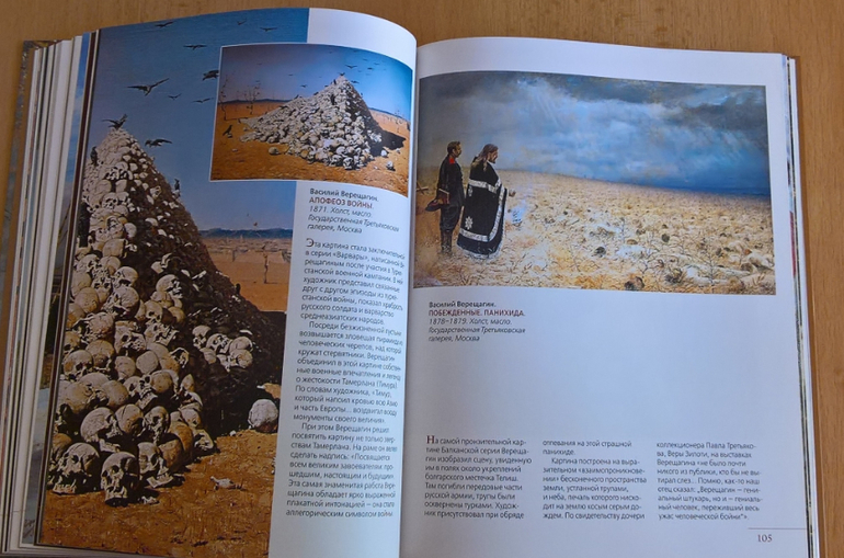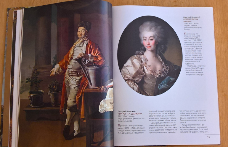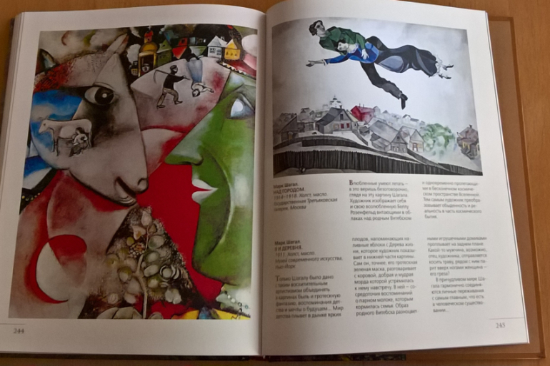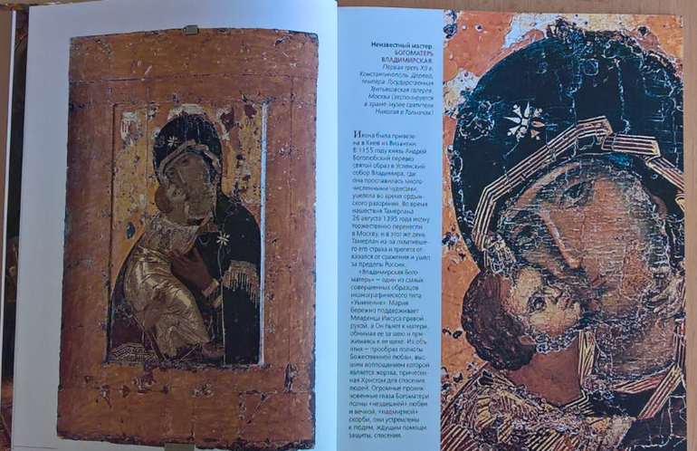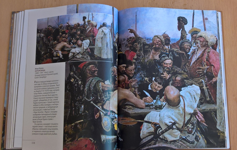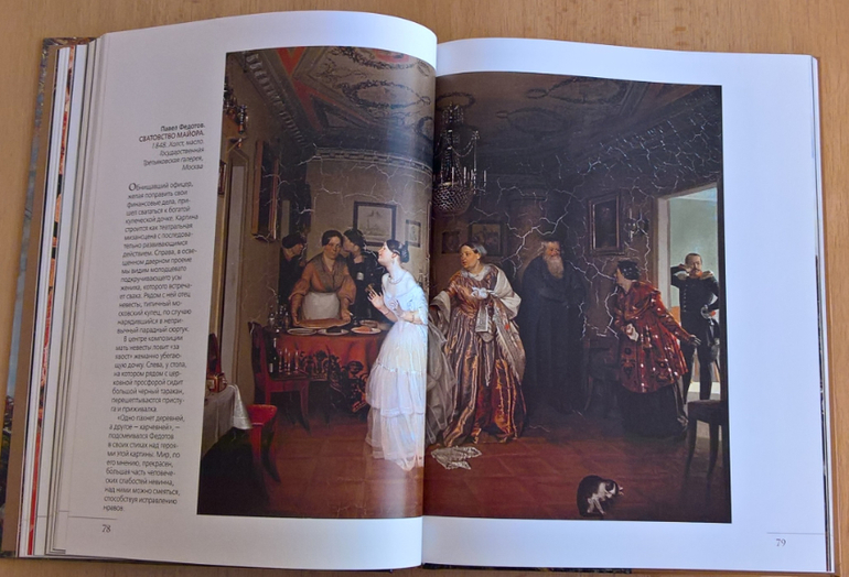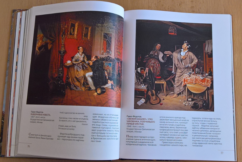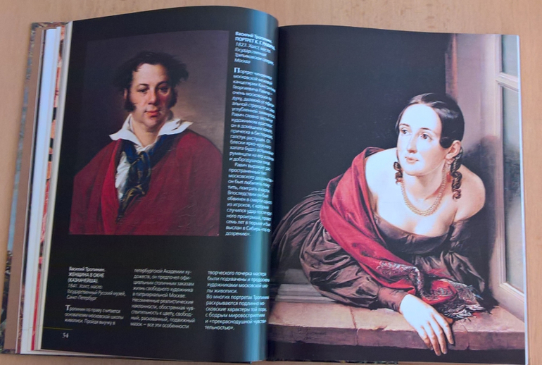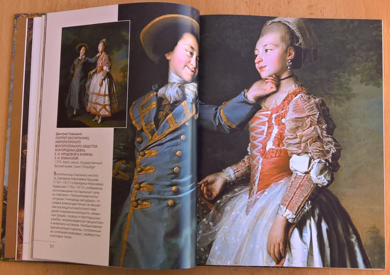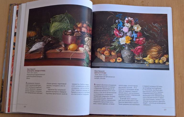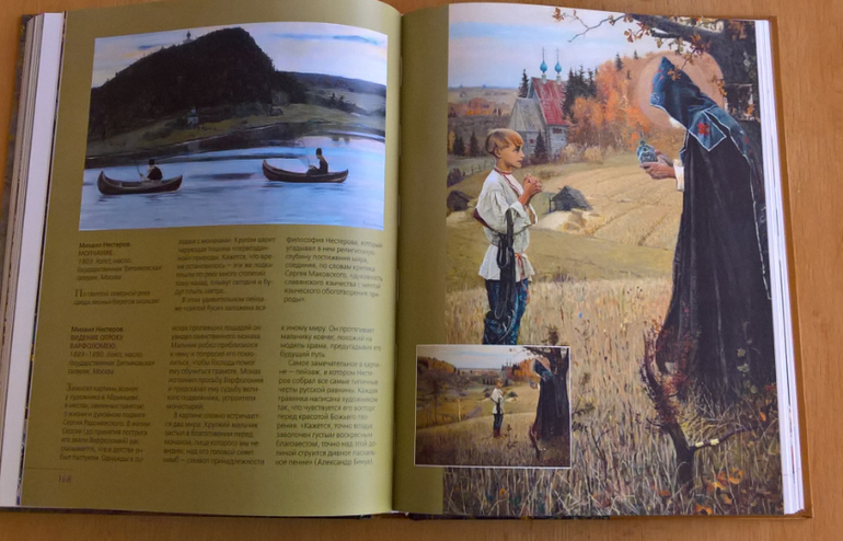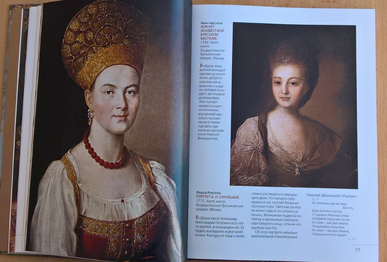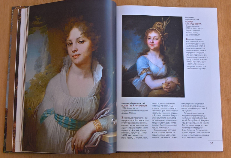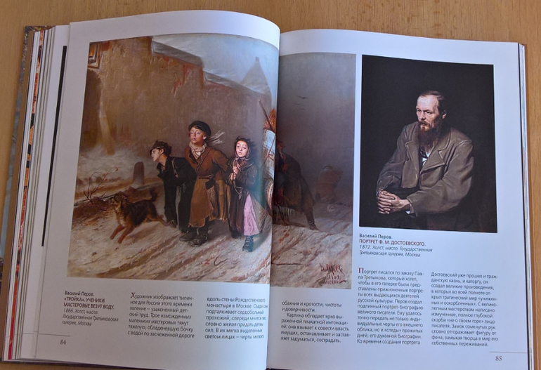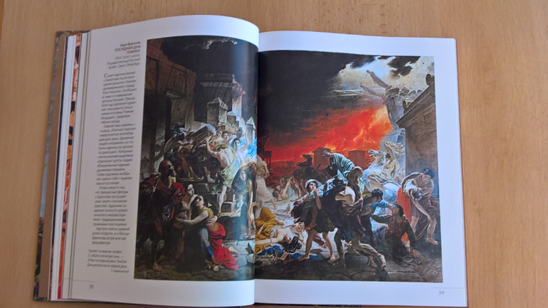 Произведения живописи расположены в хронологическом порядке, начиная с образцов древнерусской иконописи. Возле каждого шедевра указывается автор, название, год, техника живописи, место постоянной экспозиции и небольшое описание картины - что изображено, почему и зачем. Текста немного, все очень по существу, интересно и познавательно. В основном представлены произведения Государственной Третьяковской галереи (Москва) и Государственного Русского музея (Санкт-Петербург).