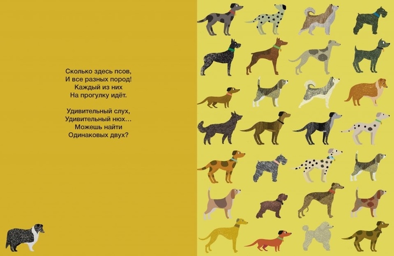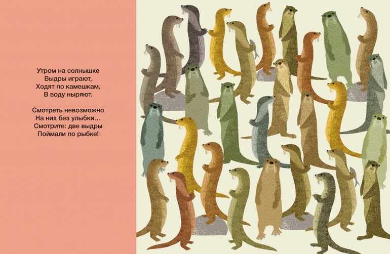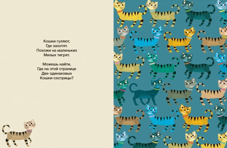 На каждом развороте затерялась пара одинаковых животных, а читателю предстоит найти их. Среди разнополосатых котов непременно будут близнецы, а очаровательные выдры выделяются уловом. Малышам - для тренировки наблюдательности!