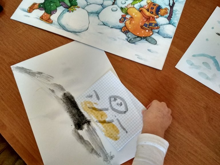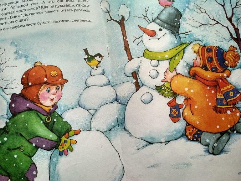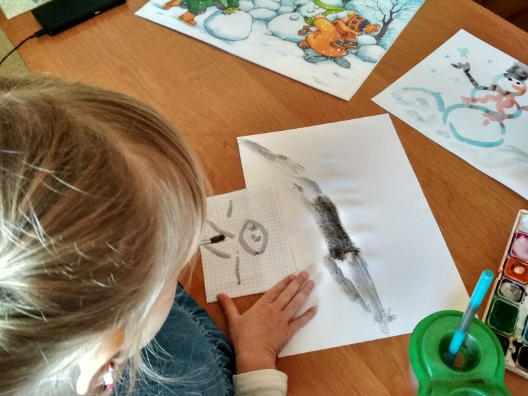 Собирались нарисовать снеговика, как советуют в книжке, но пока выходит только человечек)