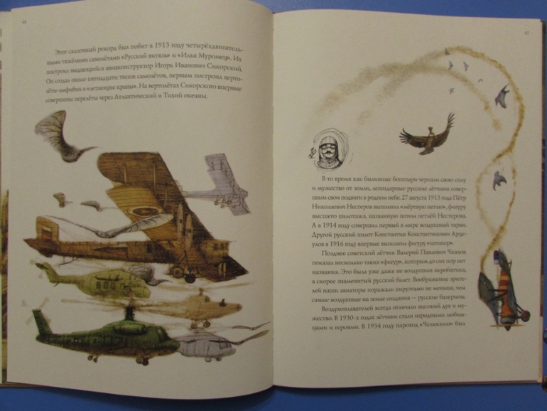В общем-то, в своем воздухоплавании Андрей Усачёв не забыл ничего, о чем следует знать и помнить: монгольфьер братьев Монгольфье, биплан братьев Райт, самолеты «Русский витязь» и «Илья Муромец» и т.д.