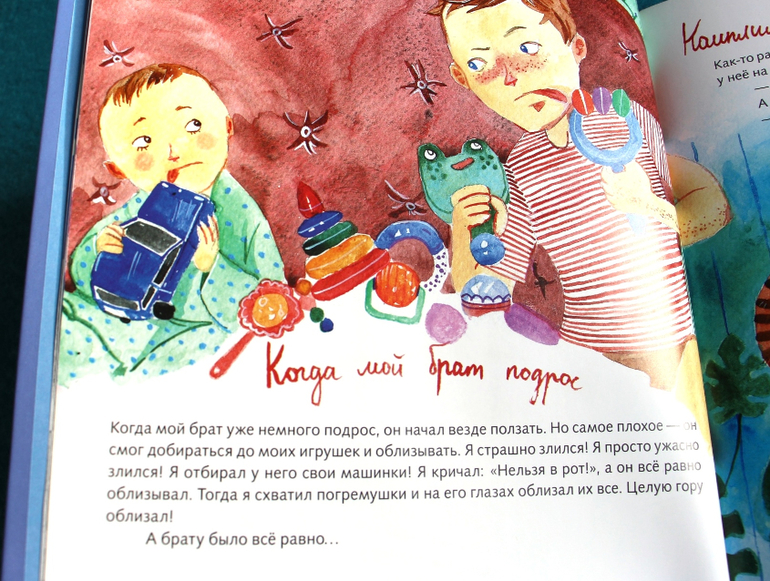 Ну, вспомните, ведь в жизни старший точно так же удивляется, как возможно, что он стоит на фотографии в шортах младшего брата и они ему как раз. Точно так же недоволен, что младший облизывает его игрушки. Но это не просто наблюдения. Текст несет в себе еще и очень положительные эмоции - все эти «трагедии» уже таковыми не кажутся.