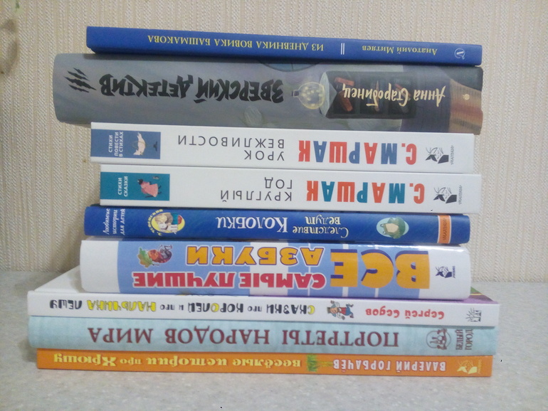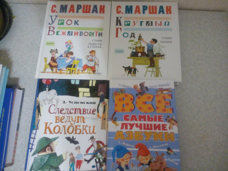 к 2 м книгам Маршака " Урок вежливости и "Круглый год" присматривалась давно. У нас есть Маршак, "Стихи и сказки для самых маленьких", оранжевая книга с коровой, но мне уже мало). А тут и Вакса-клякса, и Мистер- твистер и Пожар. Не все иллюстрации по душе, но это только моя точка зрения, ребёнок может совершенно по-иному посмотрит. В-общем, покупкой довольна, при случае докуплю ещё 2 книги из серии.
