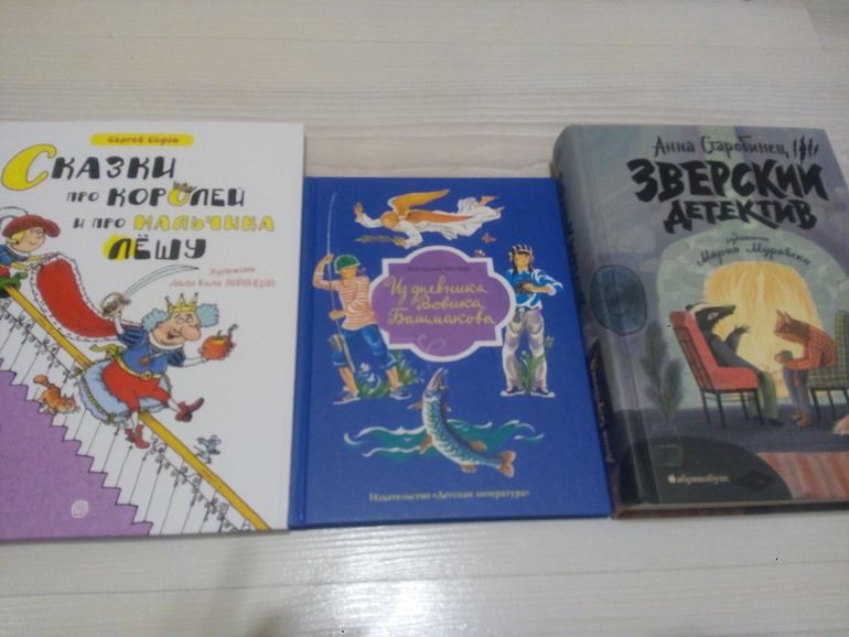 С. Седов "Сказки про королей и про мальчика Лешу". Новинка от издательства Лабиринт. Качество печати хорошее. Надеюсь, и содержание. На первый взгляд, сказки с изрядной долей юмора.А. Митяев " Из дневника Вовика Башмакова". Выбор наугад. В расчёте, что известный автор не разочарует. Ну и "Зверский детектив"). Да, ну и книжища. Таких толстых и не помню у себя. Хорошая, крепкая, с цветными иллюстрациями. И детектив! Я неё уже люблю, заранее)).И ещё 4 книги из бук24. Акция 2-я книга за рубль).