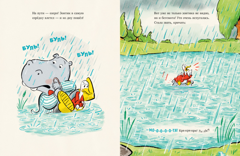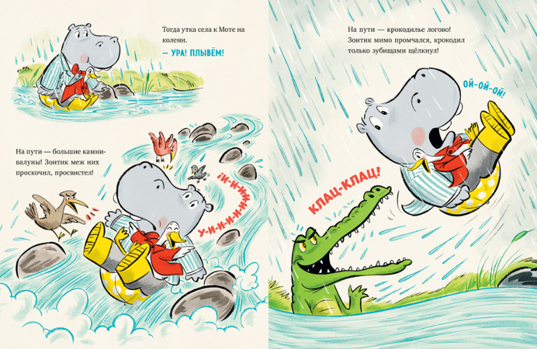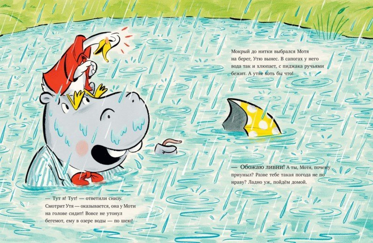 «Утя и Мотя» - закадычные друзья, несмотря на то, что они такие разные! Утя - веселая, озорная утка, а Мотя - осторожный и неповоротливы бегемот. Как-то раз Утя пригласила Мотю на необычную прогулку - прогулку под дождем! Зонтик у друзей всего один, но это не беда. Они прыгают по лужам и даже придумали поплавать в перевернутом зонтике по реке. Это оказалось не так-то просто, Утю и Мотю поджидали самые настоящие и иногда даже опасные приключения. Но, когда друзья вместе, им все по плечу.
