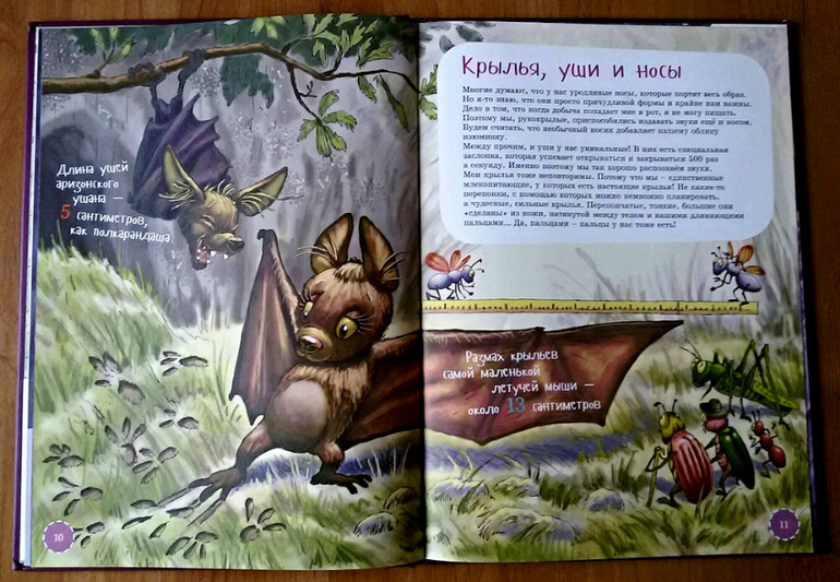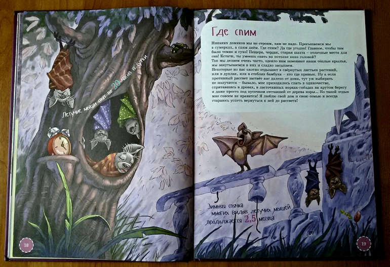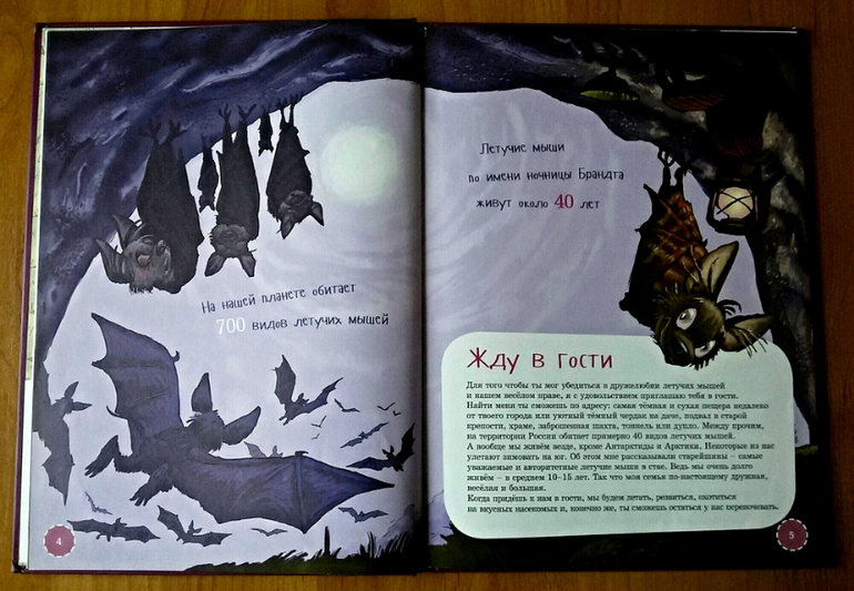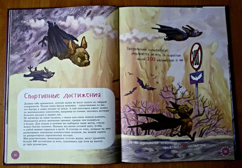 "Летучие мыши - вампиры живут в Южной Америке, у всех - морды бульдожьи, а во рту очень острые зубы - резцы. Вампиры питаются кровью птиц и млекопитающих. Летучие мыши-вампиры кровь не пьют, а лакают. Впрочем, за ночь вампир выпивает две чайных ложки крови, поэтому боятся его нечего - это никому не причинит особого вреда".