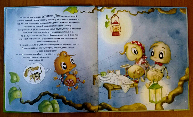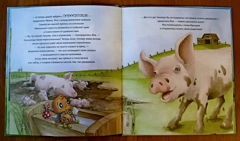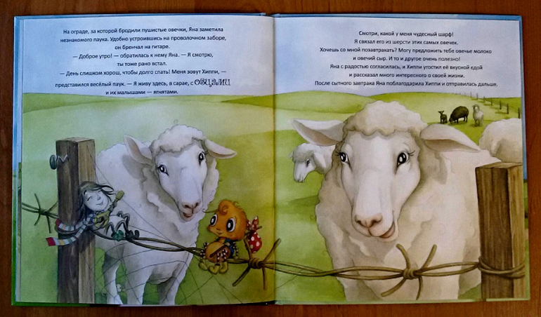 Очень нам понравилась эта книжечка. Сразу пленяют милые и приятные глазу картинки. Текст легок и познавателен, отлично подойдет для детей лет с трех. Слушая историю, малыш познакомится с животными, которые живут на ферме, узнает, чем они там занимаются и какую пользу приносят. Путешествовать по ферме мы будем вместе с маленьким симпатичным паучком по имени Яна, которая отправилась туда на каникулы.