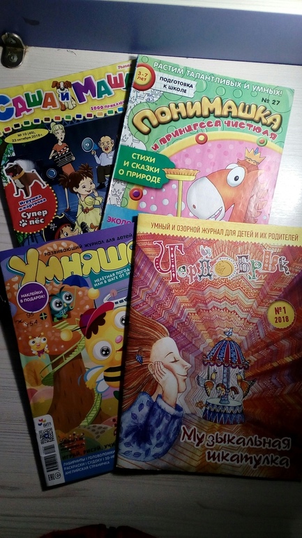 Понимашка и Умняша - развивающие журналы. Понимашку мы уже давно любим и читаем, я даже решила попробовать выписать этот журнал. А вот Умняшу мы давно не брали. На этот раз Лида сделала все задания, но этот журнал нам понравился меньше. В Понимашке в каждом выпуске есть своя тема, сюжет, который проходит через весь номер. В Умняше вроде тоже была тема - ноябрь, переход к зиме, но она как-то фоном идет. Потом вдруг про какой-то зАмок. В общем, не то. Зато там есть наклейки. Сашу и Машу я купила, читали немного. Несколько раз дочка сама садилась читать журнал.