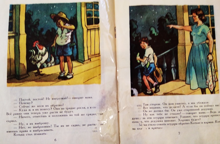 Рассказ Носова "Огурцы" принесла доча, сказав, что этот весёлый рассказ они часто читают с бабушкой. Объяснить, что веселого в рассказе доченька так и не смогла. Обсуждали вместе. Не странно ли, что товарищ отдал все огурцы нашему герою, хотя рвать их была именно идея товарища? На чьем участке рвали? Почему дедушка-сторож им вслед кричал, а они убегали? По какой причине мама героя так жестоко отреагировала на действие сына?