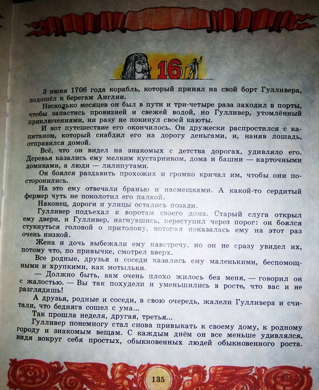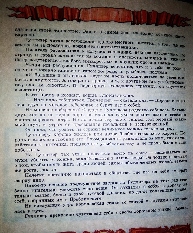 Теперь подробнее о выборе дочери. Джонатан Свифт "Путешествие Гулливера", рисунки В.Цагараев, перевод Т.Габбе, 1993г.в. - памятная книга, подаренная нашему папе на выпускной в детском саду. Конечно, было любопытно дочери узнать, что же такое интересное скрывается на страницах произведения, и рисунки необычные больших и маленьких людей. В книге представлены две части из четырех: путешествие в Лилипутию и в Бробдингнег. Первую часть о путешествии в страну лилипутов доченька слушала очень внимательно, пыталась представить своих больших кукол Гулливерами, а маленьких - лилипутами.