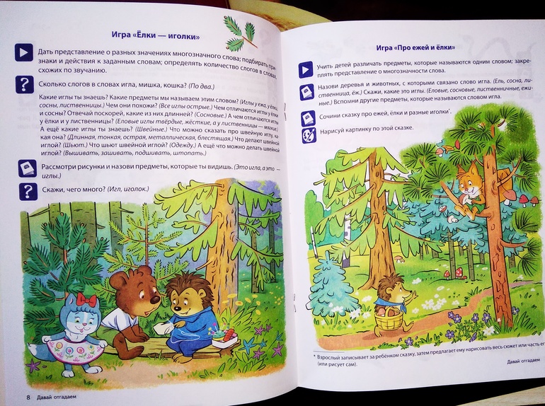 В ноябре по книге "Научите меня говорить правильно" мы рассмотрели тольк о тему "Листья": почему осенью листья желтеют, с какой целью деревья листья сбрасывают на зиму, какие бывают листья, для чего вообще нужны листья растениям. Поиграли со словом иголки: