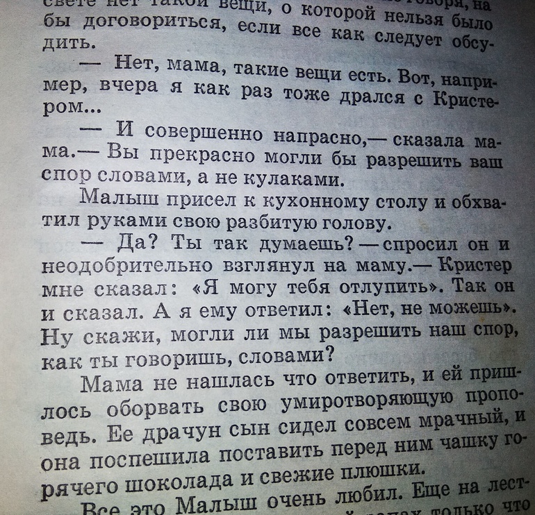 Малыш к матери прислушивается и споры с Карлсоном пытается решить словами. Какой вывод делает Малыш? Какой итог подводит Карлсон? Какие варианты есть ещё? Читаем, рассуждаем и читаем далее:
