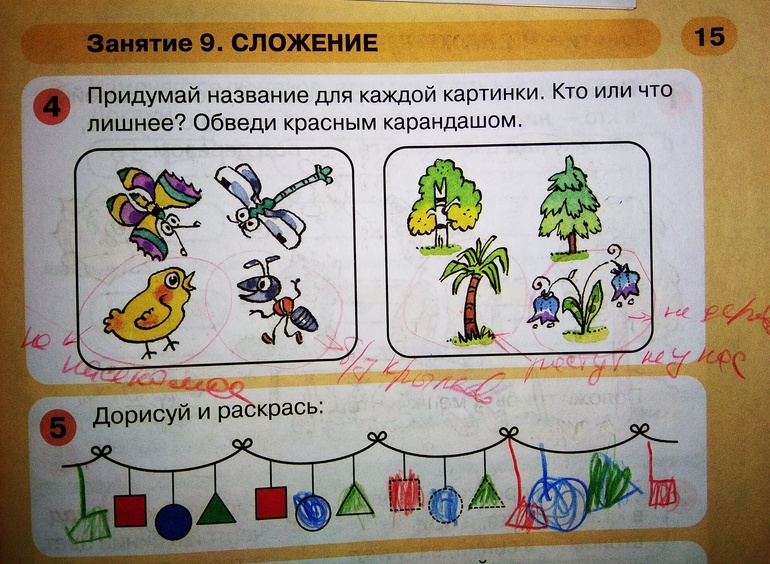 Формулировка к данному заданию в пособии Петерсона вводит в заблуждение: было бы сказано дайте название картинкам одним словом, было бы понятно, что речь только о насекомых и деревьях, а может о животных и растениях? А можно назвать "Летающие животные" и "Растения леса"? Изначально доча стала рассуждать так: слева исключила муравья, т.к. у него нет крыльев; справа пальму - растет не у нас). Возможно, что исключать нужно по размеру на левой картинке, по высоте-низине на правой? Учитывая, одинаковые ответы при первом и последнем подходе, предполагаем что лишние цыпленок и колокольчик. Жаль ответов к пособию у нас нет: