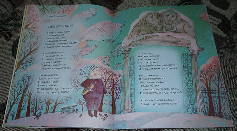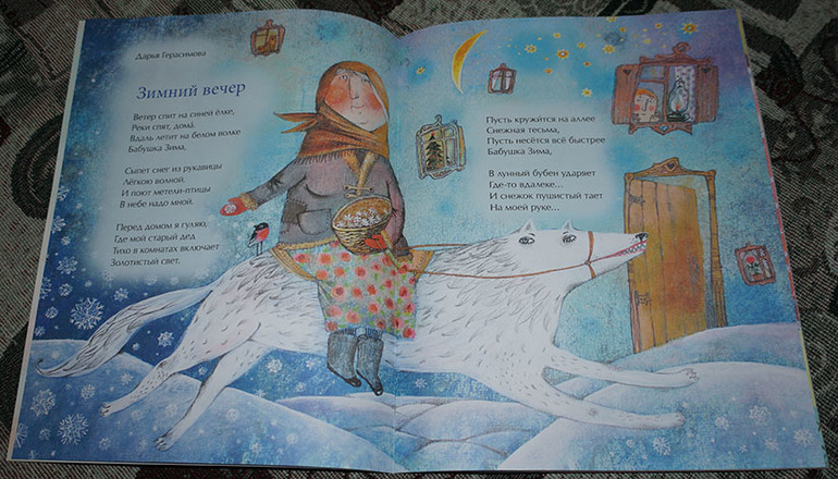 Здесь есть и наша любимая Дарья Герасимова со стихотворением про зимний вечер. Интересный образ бабушки Зимы, летящей на белом волке.