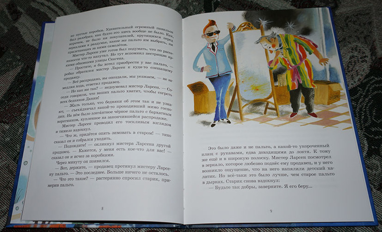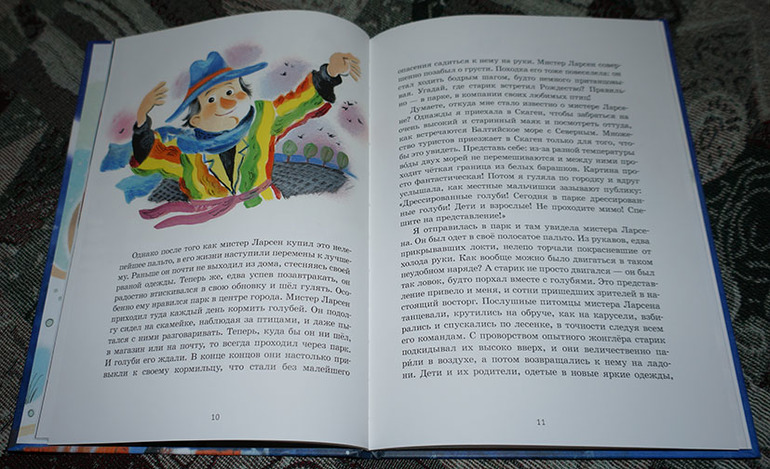 "Однако после того как мистер Ларсен купил это нелепейшее пальто, в его жизни наступили перемены к лучшему." Старик полюбил гулять в парке среди своих любимых голубей. Птицы совсем не боялись чудаковатого Ларсена и скоро все вместе они стали устраивать забавные представления для публики. Люди очень полюбили эти необычные шоу.