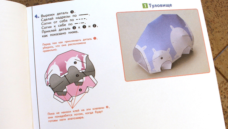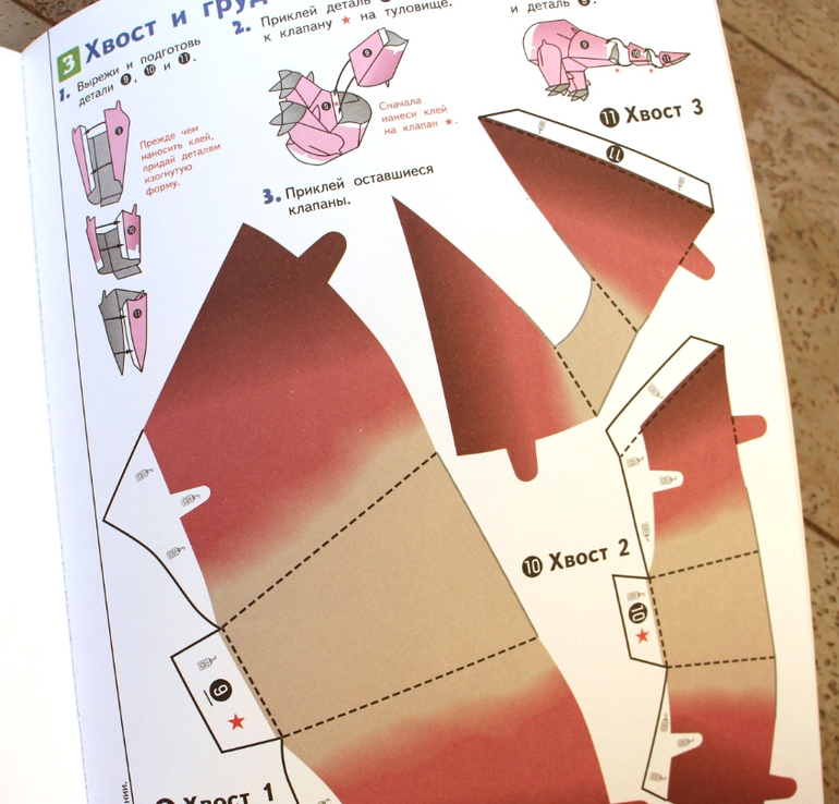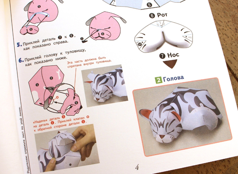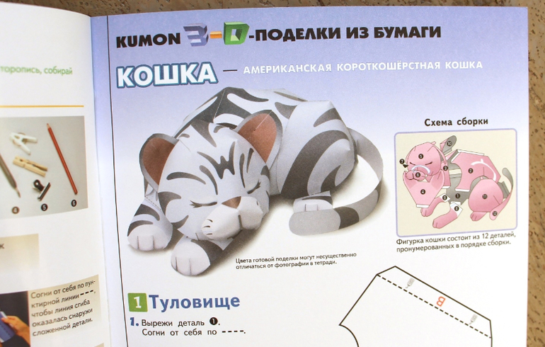 В каждой тетради по две фигуры. На мой взгляд, схема склейки не очень сложная, все зависит от индивидуальных способностей. Каждый шаг прописан и еще прорисован знаками. А еще дополнительно прорисован в виде схемы. Где сгибать, куда клей - все указано на выкройках. Детали вырезаются из очень плотной бумаги. Листы для работы надо отрезать от самой тетради (лучше родителям).