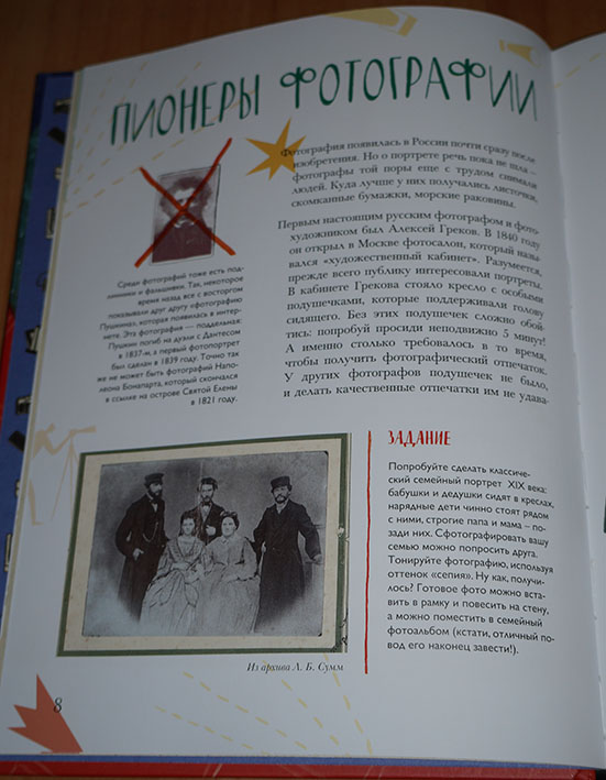 Самое интересное, что в дополнение к интересно изложенной информации, книга полна заданий на самостоятельный поиск и проработку какого-либо вопроса. Например, нужно найти в других источниках (скорее всего имеется в виду интернет) работы перечисленных мастеров фотографии и рассмотреть их, получив представление о творческих приемах и об ушедшей эпохе. Или же сделать собственное жанровое фото, репортаж.