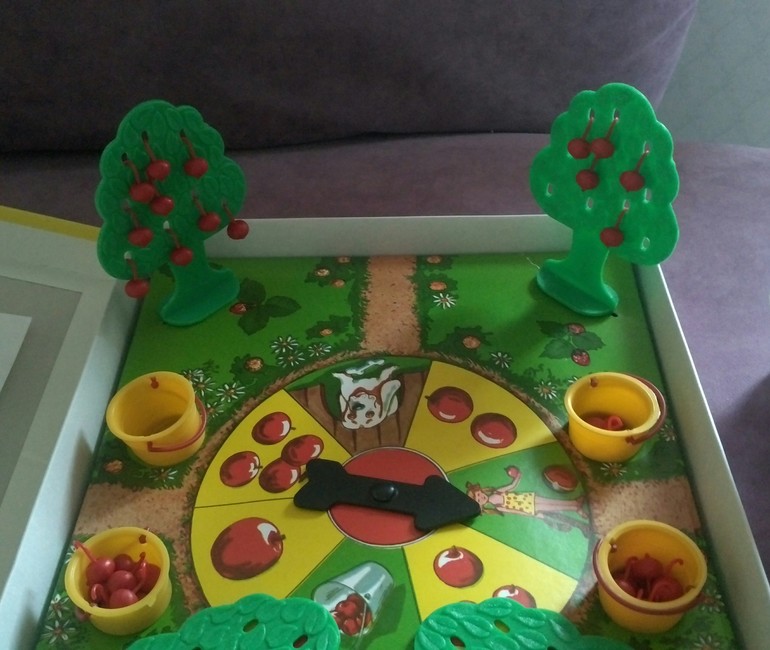 Когда я была маленькая, особого изобилия настольных игр не было. Какие-то ходилки вырезали из журналов. Было лото, домино, шашки. На фоне "обычных" игр, эта казалась просто волшебной. Столько деталей: деревья, яблочки, очаровательные ведёрки. Стрелочка, которую крутишься. В общем, любили мы проводить время за ней. Несчётное количество раз мы с подружкой наряжали эти яблони. Играли и по правилам играли и просто так.