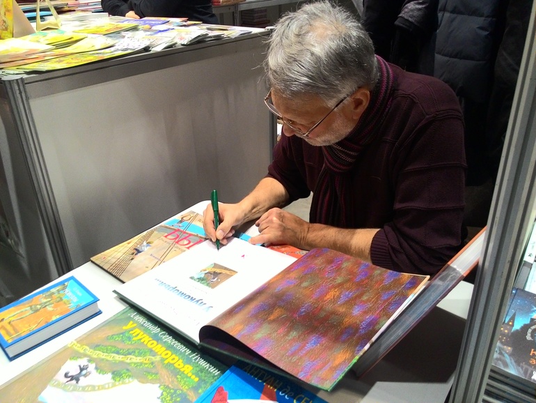 Сегодня я спешила только на одну встречу - к Михаилу Абрамовичу. Наконец-то моя маленькая мечта сбылась, и один экземпляр издания "Иллюстрации и книги. Альбом" теперь у меня. Успела подписать, сфотографироваться на память, расспросить о мильоне вещей. Надеюсь, не слишком утомила художника