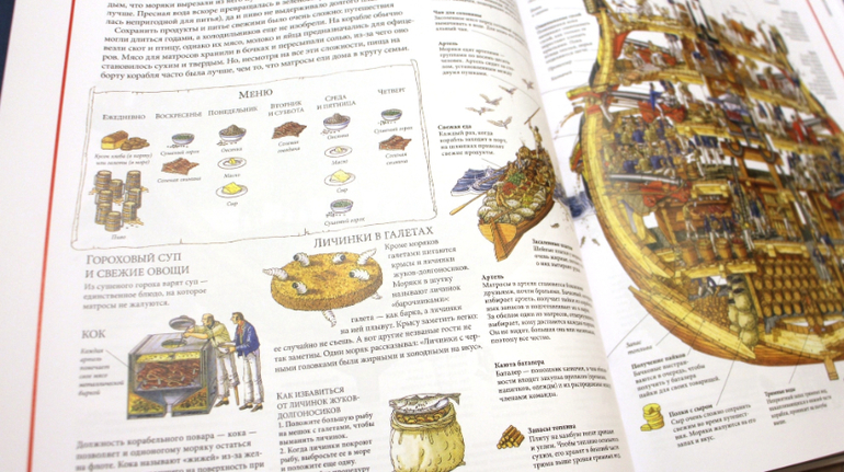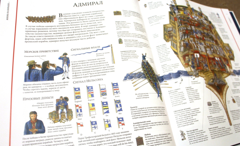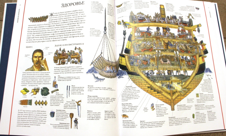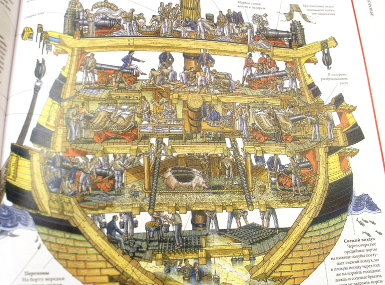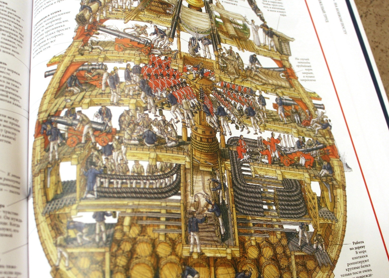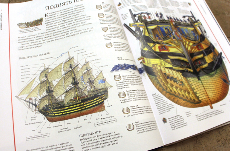 Огромный формат, плотные страницы, великолепные иллюстрации настолько подробно прорисованы, что заглянуть вы можете в каждую щелку корабля.