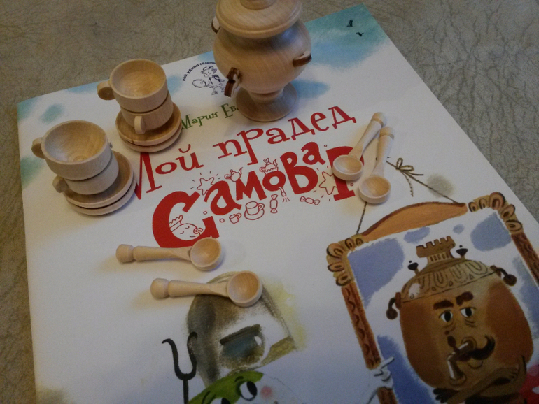 А еще в посылочке мы нашли вот такую книжку про самовар и очаровательный наборчик из дерева)))) Теплый такой, душевный)))))) Илюха с Настей сразу стали чай игрушкам разливать)))))) Леночка, спасибо тебе, родная!!!!!!!