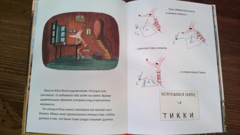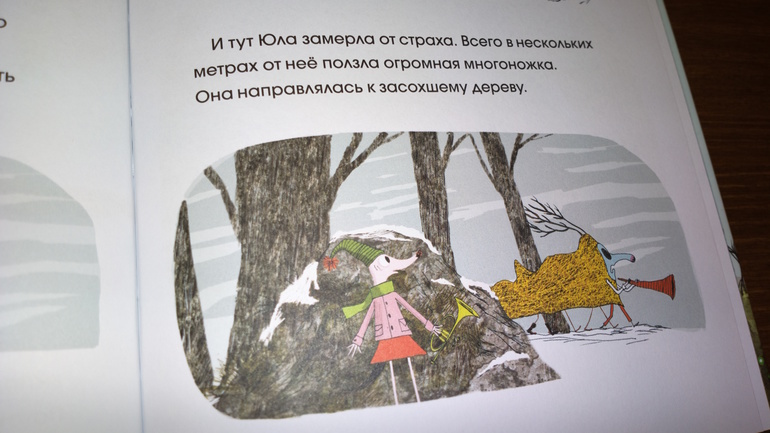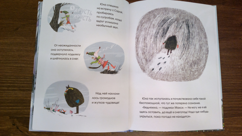 Книга подойдёт для читающих детей: здесь есть и реплики, оформленные в виде комиксов, а есть и слова автора. Взрослый может читать основной текст, а ребёнок реплики героев.
