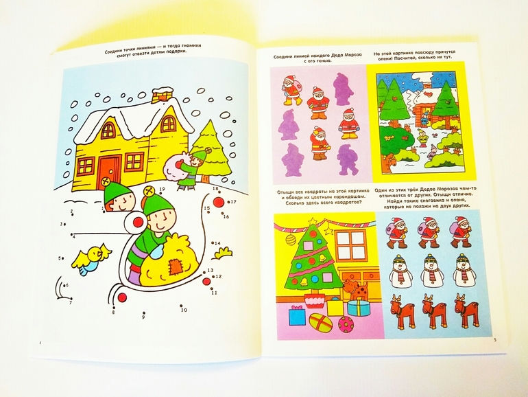 Очень неплохая тетрадь с заданиями и в принципе нормальная цена за такой объем (56 страниц). Заданий много, на каждый разворот: одно большое (первая страница) и четыре маленьких (вторая страница). Разнообразно, есть и лабиринты, и находилки, и задания с тенями, отличия, соединялки по цифрам.