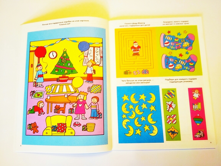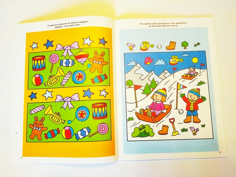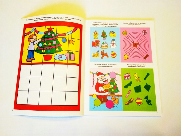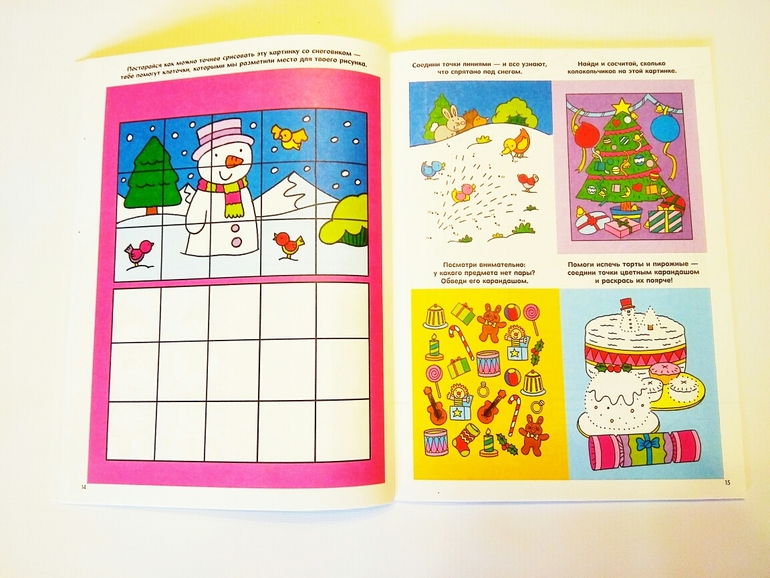 Также много рисовалок (дорисовалок, перерисовалок и пр.) и раскрасок. Что понравилось - ребенок может сам заниматься по ней. Задания интуитивные, в основном присутствие взрослого не нужно. Крепление клеевое, но страницы разворачиваются хорошо, можно даже разобрать по листам при желании.