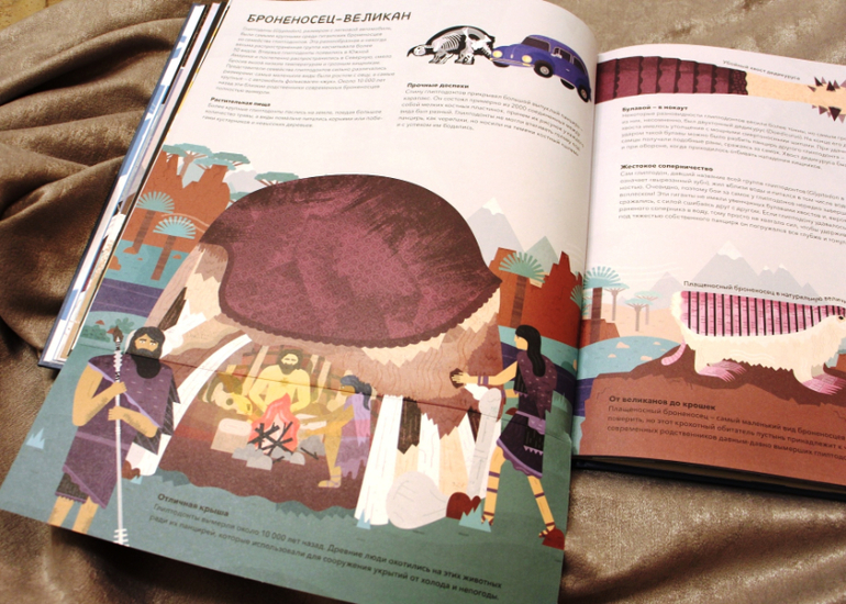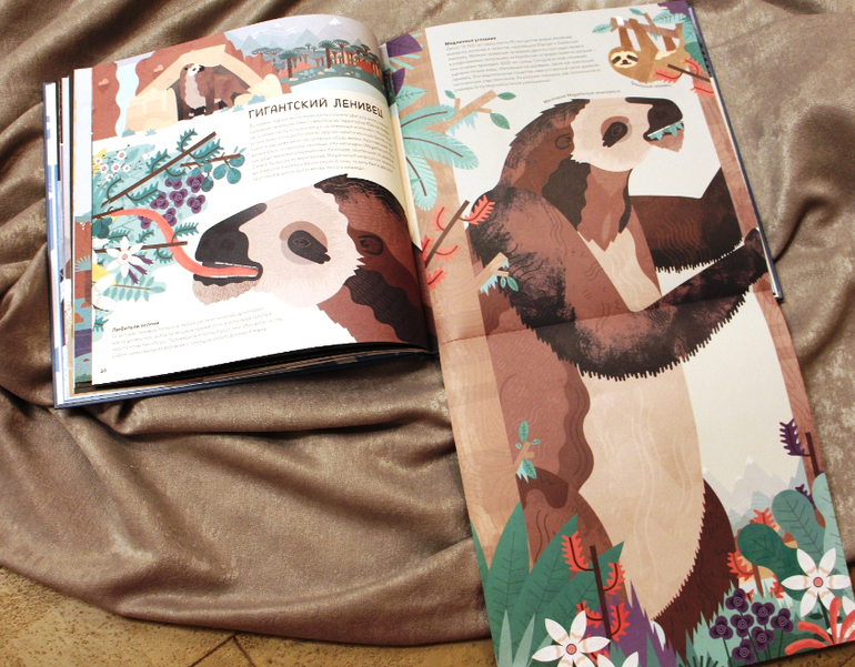 В книге вообще куча гигантов. И гигантский ленивец - если сравнить разницу его пропорций с обычным, просто поражаешься, как он вообще выживал. Вот эта особенность книги мне сильно понравилась: многие страницы увеличиваются путем отгибания части листа (иногда размером во весь лист) и это позволяет разместить гигантов так, чтобы современный «аналог» была возможность тоже разглядеть.