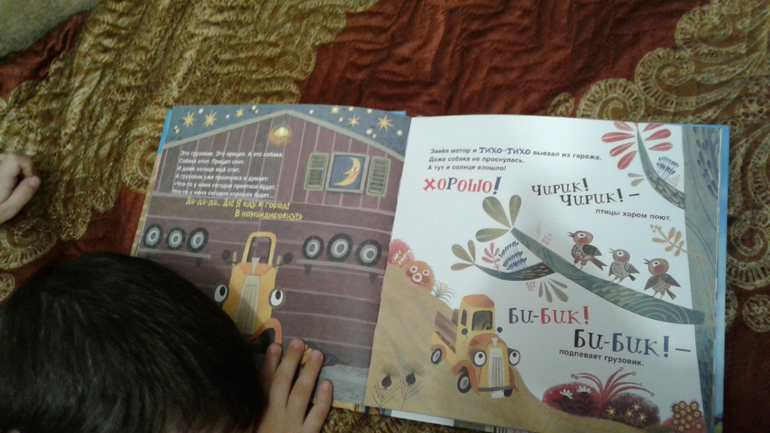 Хвастик (показываем книжные покупки)Наконец то решилась на приобретение книги про грузовик и прицеп. Думала раньше, что нам уже не по возрасту. Видела на скриншотах книг обилие коротких простых слов для произношения ребенком, видимо для развития речи. Ну, у нас речь то уже развита (помолчал бы хоть иногда 😵). Но книга приятно удивила! Текста немало, и сама история неплоха. Знаю, что это не первая книга в серии (мы купили "Грузовик и прицеп едут в командировку"), вроде первая книга попроще. Думала, не купить ли к новому году книгу из этой серии что-то там про елку... Но почему то остановилась на этой. Вот несколько фото (и довольный сын 😄):
