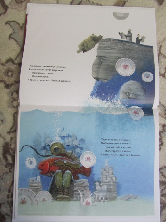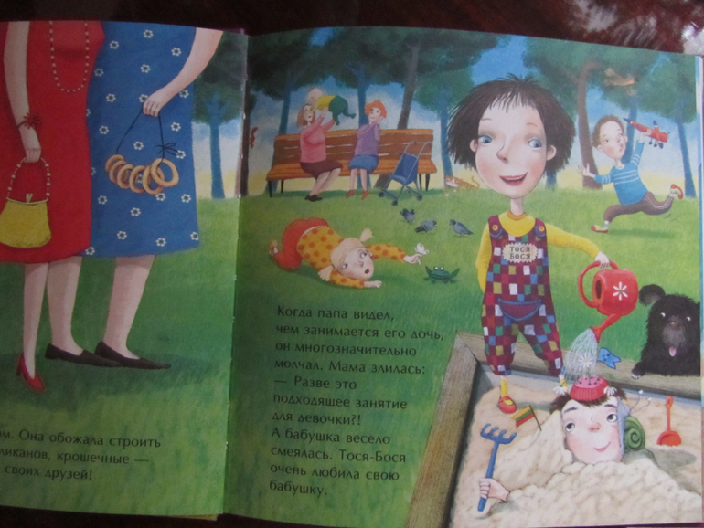 А ещё и сын и дочка всё время хихикают на этом развороте, где Тося поливает своего друга закопанного в песок из лейки( хотя вид у него очень довольный - видимо он не испытывает никакого дискомфорта по этому поводу)