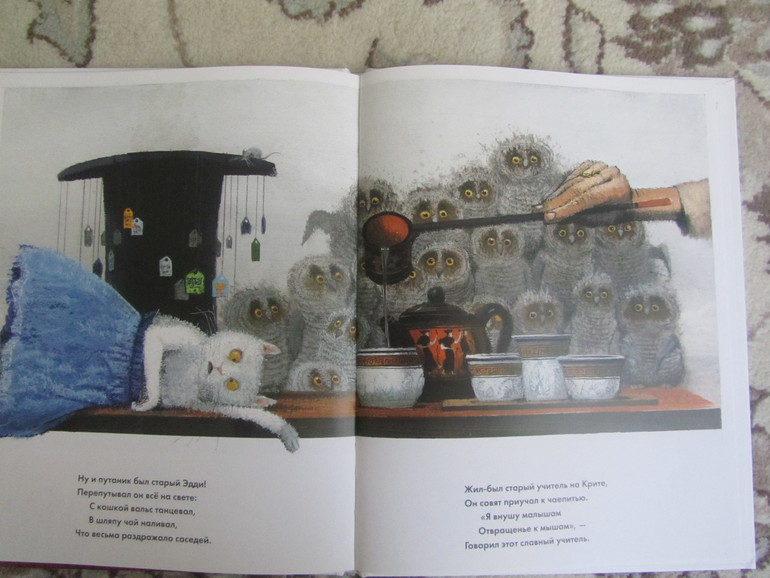Наверное я могу себя причислить к поклонникам творчества Олейникова, чем то цепляют меня его рисунки, порой совсем не детские я бы даже сказала. У нас уже есть книга со стихами Хармса и его иллюстрациями, кстати иногда детьми почитываемая, и вот не смогла удержаться перед этой. Давно посматривала на абсурдные стихи Лира, чем то привлекают они меня. Купила я значит и мы сели всей семьёй читать, папа наш быстро сдулся и сказал, что-то типа зачем этот бред купила.. Но я не сдалась, в итоге детям книга понравилась, и они даже выделили пару самых понравившихся. На первый взгляд может показаться, что стихи совсем не складные и бессмысленные, но стоит только поймать ритм и включить воображение..А вообще в стихах в большинстве случаев каждый видит своё и смысл у всех разных и тут вовсе не надо быть знатоком английской поэзии.