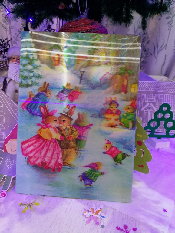 Люба (Голубка) прислала нам невероятную открытку, как в детстве, крутишь ее из стороны в сторону и изображение на ней становится объемным...сын первый раз такую видел, для него это прям открытие)) как, почему, зайчик же вот он, а почему его взять не могу)))) Люба, спасибо за доставленную радость!! Пусть новый год принесет с собой много счастья, любви и тепла в ваш дом!!!