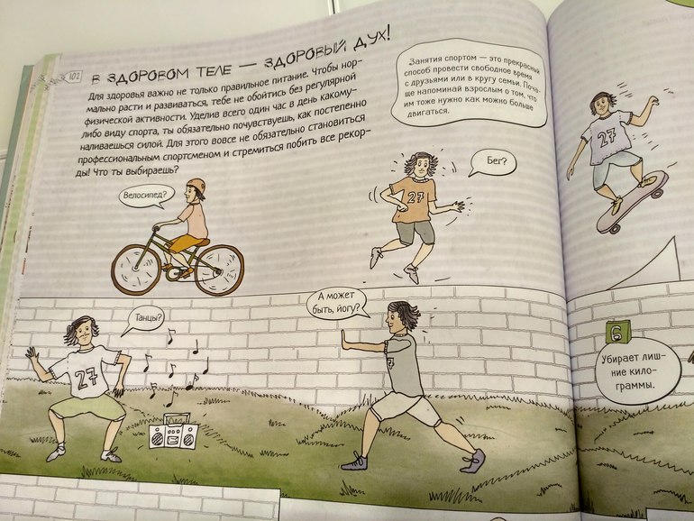 На первом развороте мы видим пирамиду здорового питания, в основе которой автор отмечает подвижные игры и спорт. С чем я полностью согласна, одной правильной еды для здоровья мало, нужен ещё и правильный образ жизни.