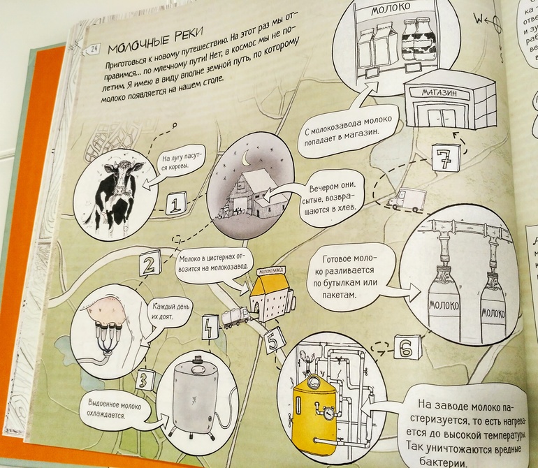 Понравилось очень рисунок о том, какой путь проделывает молоко, прежде чем попадает к нам на стол: