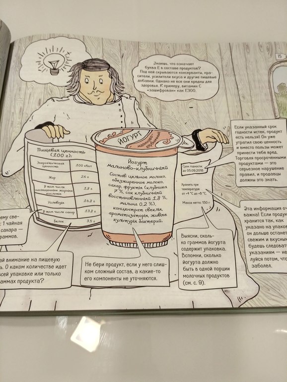Очень заинтересовал дочку разворот про этикетки, достали их холодильника йогурт, сметану, сливки, сыр читали и изучали. Это то, что мы делаем в повседневной жизни, перед покупкой.