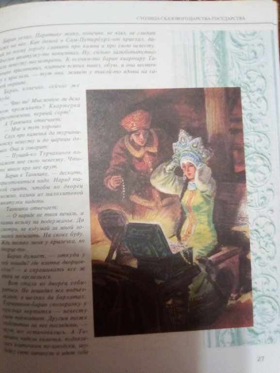Танюшка примеряет украшения из малахитовой шкатулки: