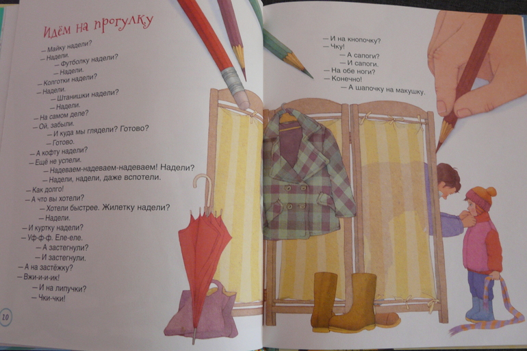 Хотела показать эту книгу даже отдельным постом! Сборник стоял на полке достаточно долго. Как-то волевым моим решением взяли почитать и ребенку оч. понравились стихи. В идеале книга рассчитана на более младший возраст, но даже нам она тоже актуальна . Простые и понятные стихи разных авторов про детские будни. Про игры в песочнице, про прогулки, про игрушки, про друзей. Особенно хочу отметить иллюстрации. Думаю то, что нужно для первого сборника, картинки четко отражают то, что написано, идет визуальная поддержка текста, что важно маленькому слушателю! Картинки яркие, но не режут глаз. Бывают книги, где иллюстрация на всю страницу и сверху текст, глаза разбегаются, а нужно еще текст при этом воспринимать. Думаю, для малышей оптимальный вариант, четкие узнаваемые образы на светлом фоне. Читаем про игру в песочнице.. вот тебе песочница, вот дети, вот совки, вот ведра ...:) Это очень важно для детей, живущих в других странах, некоторые дети на слух вообще не понимают, что им читаешь, а стихи особенно..В общем, рекомендую!
