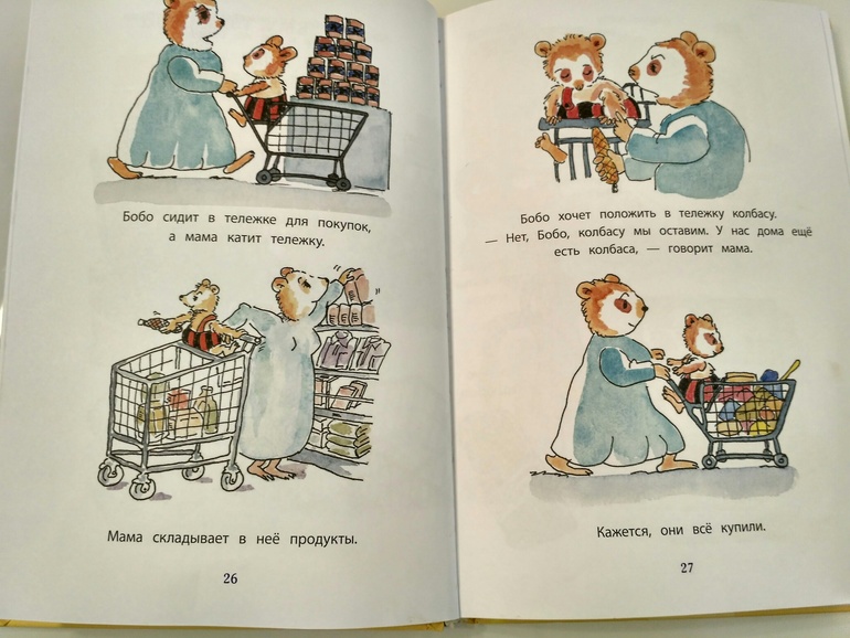 По сути это даже не чтение, а рассказ по картинкам, мы смотрели как Бобо просыпается, завтракает, ходит за покупками и сравнивали как и что делаем мы. В сотый раз говорили о том, что нельзя в магазине брать все подряд с полок и класть в корзину.