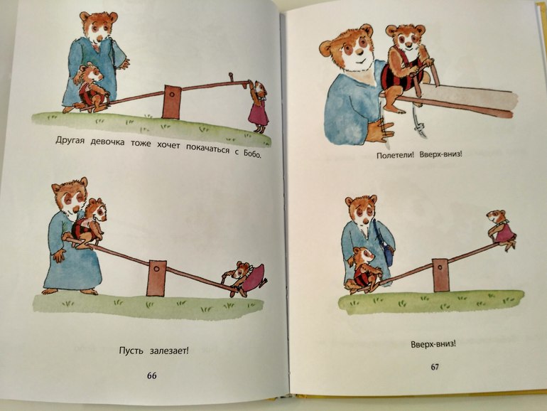 Очень любит Даша рассматривать как гуляет Бобо, как он катается с горок, на качелях, про очередность, совместное катание с другими, что особенно актуально в этом возрасте.