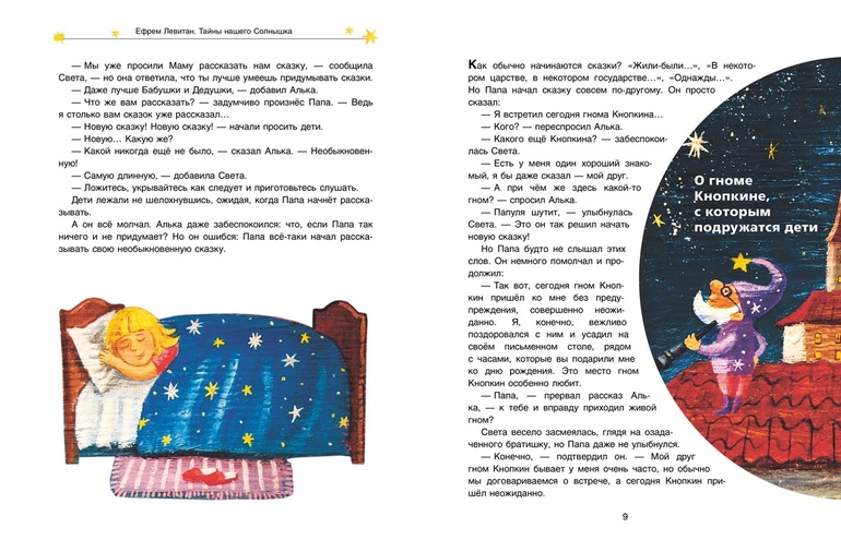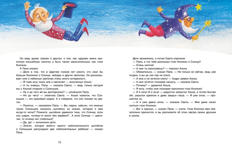 Каждый вечер перед сном Алька и Света погружаются в сказку, которую сочиняет для них Папа. Вместе с гномом-астрономом Кнопкиным дети шаг за шагом открывают для себя новую увлекательную науку, наблюдают за Солнцем и Луной, учатся читать карту неба, отправляются в далёкий волшебный полёт - и это далеко не все их приключения!