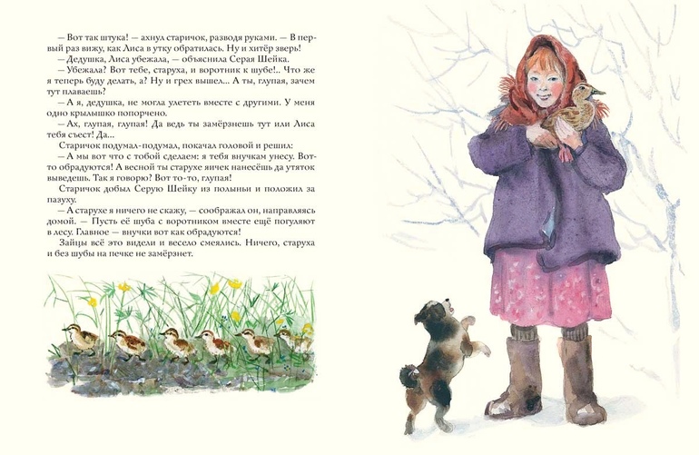 Серой Шейке предстоит провести холодную зиму совсем одной. Все её сородичи улетели в тёплые края. Но она не отчаивается и даже находит друга - Зайца. Всё бы ничего, но только к реке начала приходить Лиса… Сможет ли уточка со сломанным крылышком спастись от коварной Лисы? Любимую многими сказку проиллюстрировал художник, тонко чувствующий и понимающий природу, - Георгий Никольский.