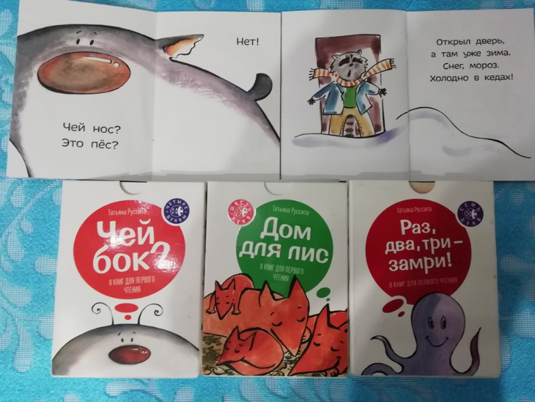 Серия книг для первого чтения Татьяны Русситы. Они тоже смешные. Поэтому понравились. Недавно он сказал про них: "Мама, убери эти книги, они для малышей, я уже хорошо читаю". И тут же сел и так увлекся, что все их перечитал)))