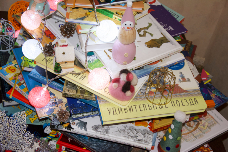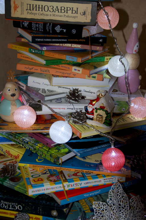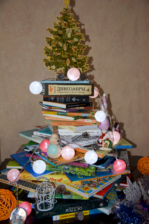 У нас теперь нельзя книжные елки устраивать, у нас теперь вообще нельзя стопки книг на полу оставлять - новый питомец чешет свои острые зубы об книжки ((( Кошатина наша безобразница. А у вас елка прекрасная!