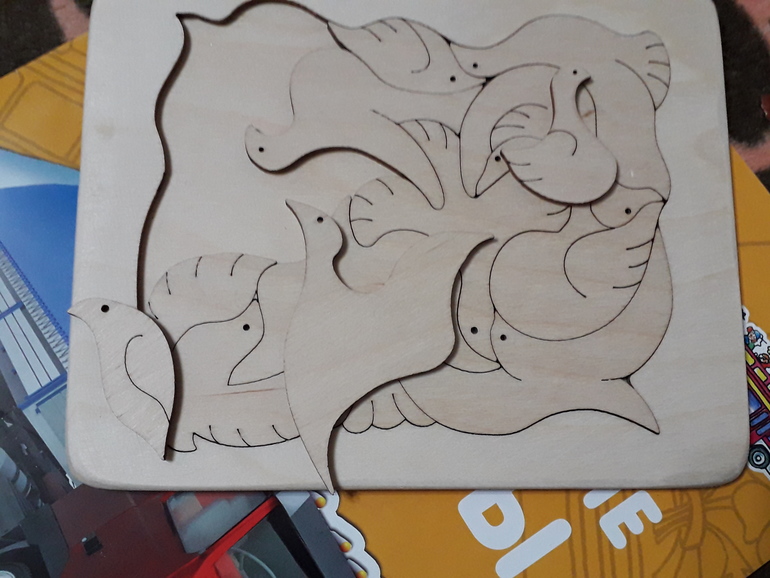 Сначала про деревянное....сын схватил этот пазл и первым делом давай изучать, как это он так устроен. Птички подобраны идеально! Долго будешь ломать голову, как их разместить. Благо хоть картинка есть.