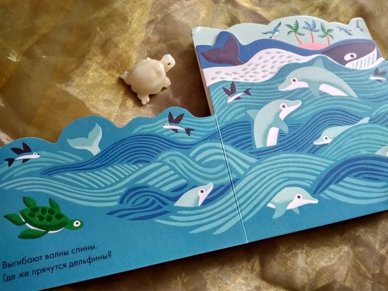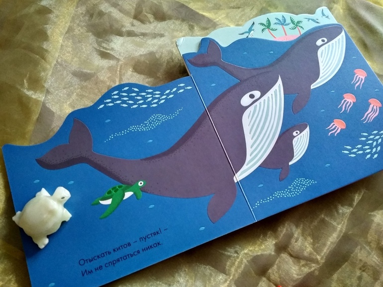 Стихи очень простые и короткие - по паре строк на страницу. Сюжета, практически, нет - просто рифмованные строчки предлагают маленькой черепашке вместе с читателем найти кого-то на этом развороте. И, если с малышами есть смысл что-то разглядывать и пересчитывать количество обитателей океанских глубин, ощупывая при этом выпуклости на странице, то у детей постарше главная задача - прочесть текст.