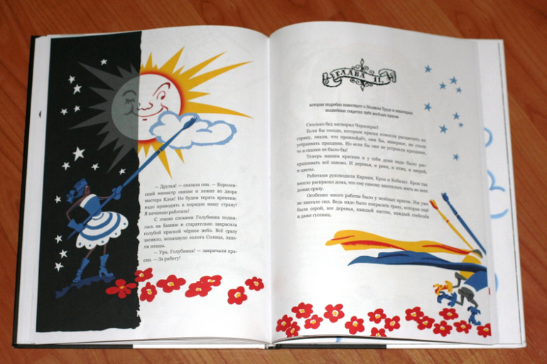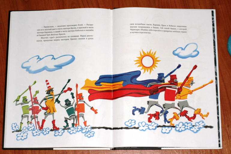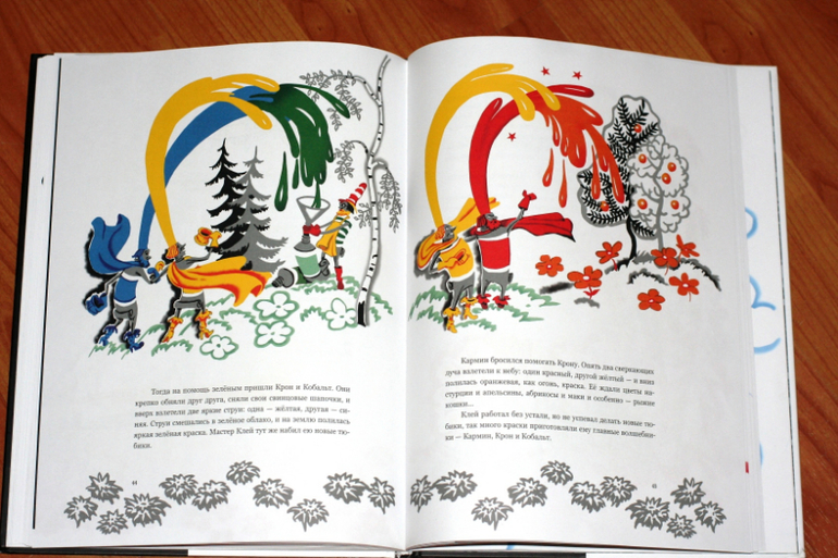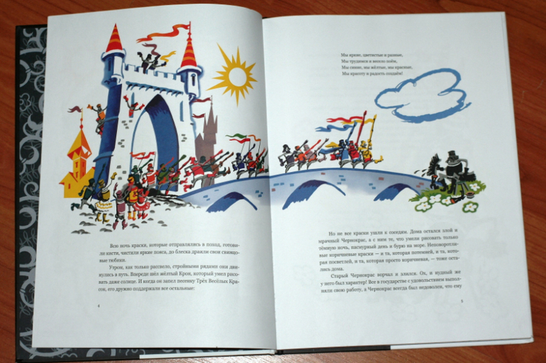 Совсем нет времени писать даже коротенькие дневники библиотечного чтения. Но этой книгой просто не могу не поделится. Будет мало букв и много фото. Книга, написана советским художником и им же проиллюстрирована. Переиздана издательством Речь, в очень хорошем качестве, формат А4, тесненная обложка, страницы плотный белый офсет. Приятно держать в руках. Остросюжетная история о том, как в сказочной стране красок, где главными были жёлтый Крон, красный Кармин и синий Кобальт, власть захватил злой Чернокрас. Мой ребенок обожает такие динамичные сюжеты. Попутно раскрывается теория смешения красок. Тема для нас не нова, но любима. Книгу прочитали несколько раз. И будем брать еще. Меня в книге особенно подкупили именно иллюстрации, яркие, контрастные, глаз радуется. На каждой странице, довольно крупные. На мой вкус - оптимальное соотношение количества текста и иллюстраций. Думаю, подойдет для чтения, с 4 лет.