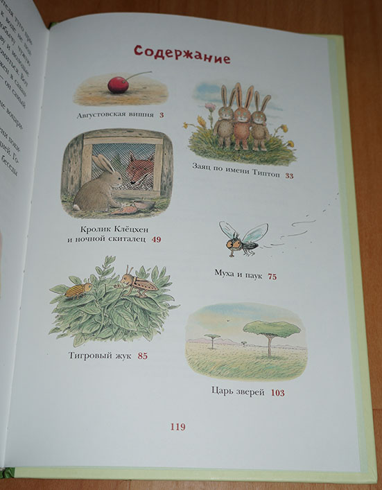 История про августовскую вишню - самый настоящий детектив. Ни за что не догадаетесь, чем она закончится! Есть в книге и другие весьма неожиданные персонажи. Заяц Типтоп, например, храбрый от незнания и наивности. Однако, храбрость его всё равно подействовала на хищников должным образом.